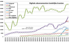 onderzoeken of samen drukken voordelen kan opleveren? En ten tweede daalt de gedrukte oplage van alle dagbladen mede door de vele digitale abonnementen in een steeds hoger tempo, en daarmee daalt ook het aantal benodigde krantenpersen. Op de grafiek het verloop van de digitale abonnementen bij landelijke dagbladen (bron: Piet Bakker).