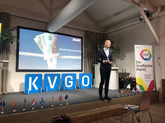 De taak om om vijf uur, vlak voor de afronding van het gehele programma nog met talrijke cijfers, grafieken en tabellen het publiek bij de les te houden, lukte AWVN directeur Raymon Puts buitengewoon goed. Hij bleef daarbij vooral praktisch en nam het publiek in vogelvlucht mee door de betekenis van al die kengetallen, die wel degelijk invloed hebben op de dagelijkse gang van zaken binnen de bedrijven. Hij hing zijn lezing op aan het komende cao seizoen, voer voor werkgevers en werknemers. Puts zei over de grafische branche, dat deze in zijn algemeenheid niet 'uit de pas' liep op vele kengetallen ten opzichte van andere branche. Geruststellend? Dat mag u zelf beoordelen.