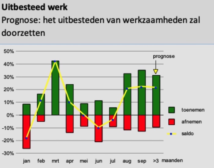 In bovenstaande grafiek is het opvallend dat 'uitbesteden van werk' vanaf augustus door ondernemers wordt gekenmerkt door een (forse) toename. Hoe dat precies veroorzaakt wordt, is echter niet uit de cijfers te halen. Slechts een kleine 10% zit uitbestedingen afnemen, ruim 30% ziet het toenemen en dat is in lijn met de afgelopen maanden.