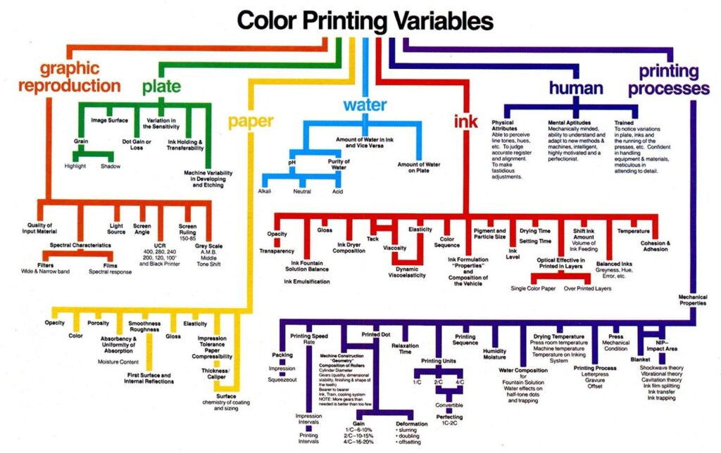 PRODUCTIE INNOVATIE - De Vlaamse kleurspecialist Eddy Hagen toonde een schematisch overzicht, welke hij 'ergens tegenkwam' met de zovele parameters die van invloed zijn op kleur. Hij adviseert dit overzicht vooral te laten zien aan brandowners en/of printinkopers in zijn algemeenheid.
