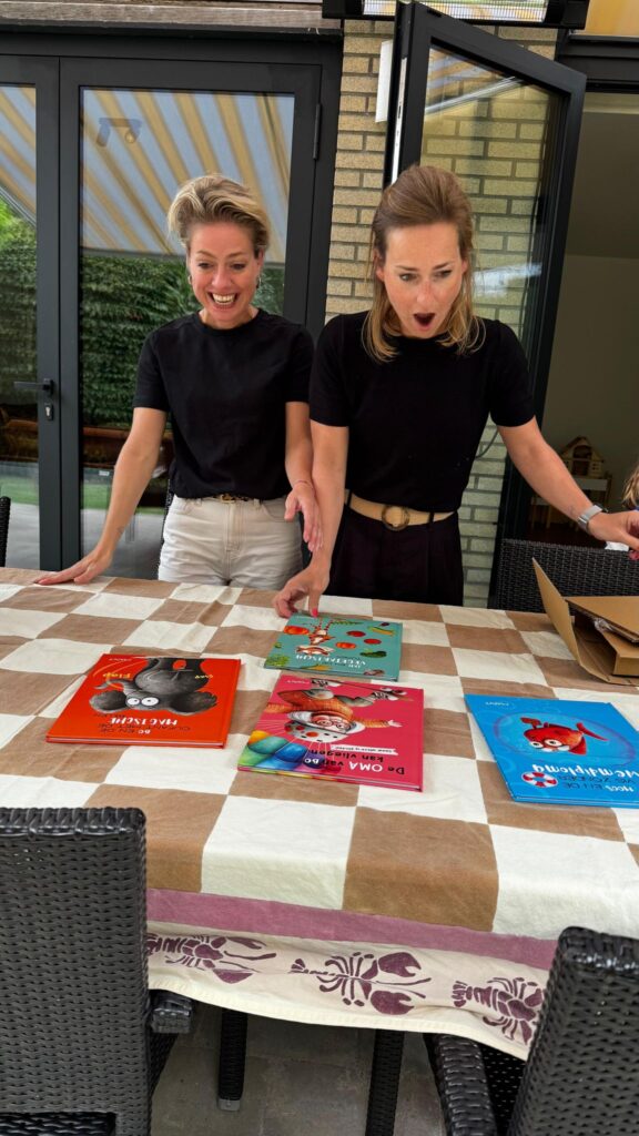 Toen de techniek stond, begon het creatieve avontuur. De zussen besloten alles zelf te maken: Mirjam schrijft, Merel illustreert. “Het is zó leuk om hier samen aan te werken,” zegt Merel. Mirjam: “Het schrijven ging eigenlijk vanzelf. De uitdaging zit vooral in zo weinig mogelijk tekst gebruiken, maar toch een goed verhaal vertellen. We kwamen al snel op het idee om met tegenstellingen te spelen in de verhalen: een giraf met hoogtevrees, een vis zonder zwemdiploma of een vegetarische tijger.” De creatieve energie bleek groot: binnen een half jaar brachten ze al acht originele titels uit.