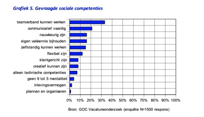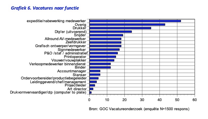 Ondernemers werven vooral mensen die in teamverband kunnen werken en communicatief vaardig zijn. De vraag naar medewerkers in nabewerking en/of expeditie is opvallend groot. Accountmanagers, leidinggevend personeel en projectmanagers 'bungelen' onderaan de lijst. Dat is opvallend in een branche waarin juist steeds meer 'procesbeheer' een grotere rol toebedeeld heeft gekregen.