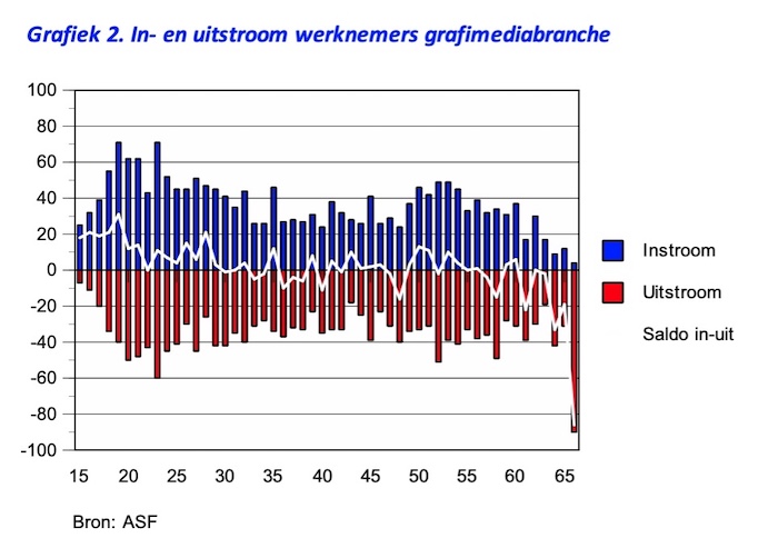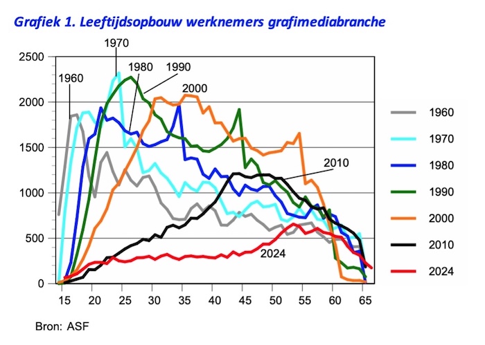 In deel 1 werden de cijfers vermeld van de krimp van de branche sinds 2007. En ook de relatieve toename van het aantal vrouwen door toename van meer creatieve beroepen in vergelijking tot puur technische beroepen. De leeftijdsopbouw binnen de branche laat zien dat de verschillen in de afgelopen decennia fors groter zijn geworden. Tot en met het jaar 2000 vertegenwoordigde de branche een gezonde balans tussen jonger en ouder. In 2010 schoof de leeftijd al flink op naar een meerderheid van boven de 40 /45 jaar. Anno 2024 is die verschuiving nog veel groteren laat zien dat de meerderheid al de leeftijd heeft tussen 50 en 55.