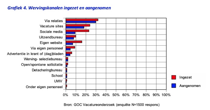 Het meest populair om in te zetten is het werven van personeel via relaties. Als tweede het werven via speciale vacaturesites en als derde de sociale mediakanalen. Ook worden vacatures op eigen websites geplaatst, maar lang niet altijd. Dat maakt het in kaart brengen van werkelijke aantallen vacatures vrij lastig.