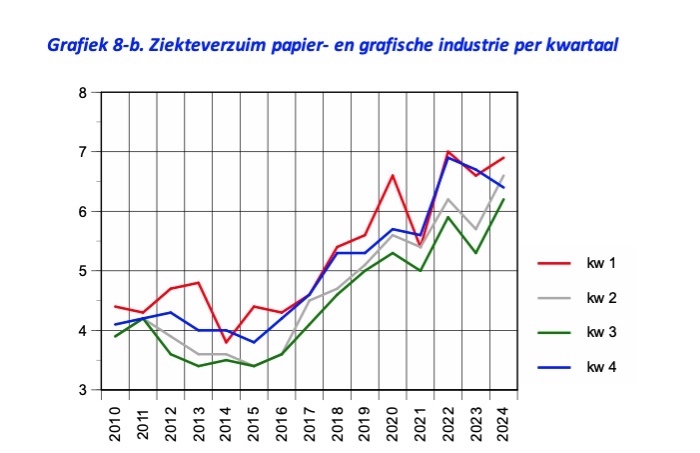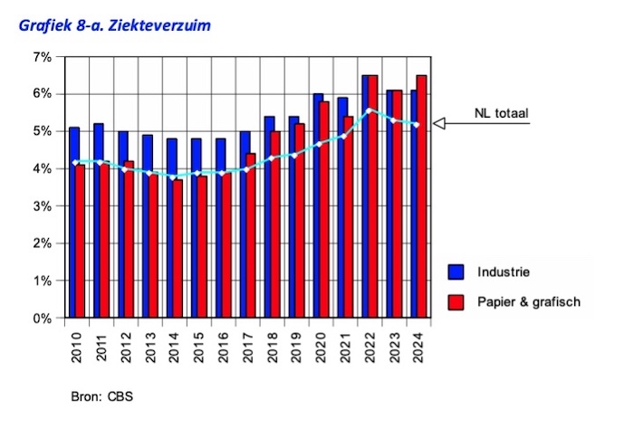 Door het CBS wordt het ziekteverzuim binnen de branche gecombineerd voor de grafische branche en de papierbranche. Daardoor is het niet precies na te gaan hoe de verhoudingen precies liggen. In beide bedrijfstakken komen zware werkzaamheden voor, maar volgens onderzoeker Jos Teunen kunnen de verschillen in cijfers niet groot zijn, doordat de bedrijfsgroottes voor klein, midden en groot forse verschillen laat zien tussen de grafische branche en de papierbranche.