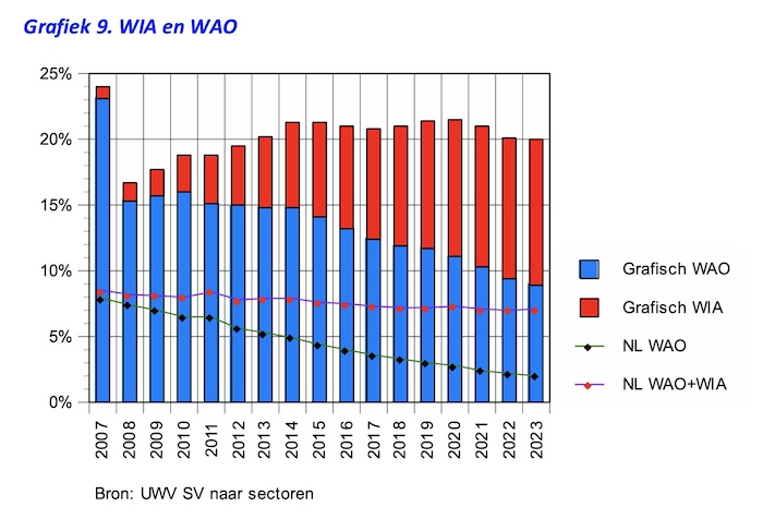 Uit het rapport: 'De mate van arbeidsongeschiktheid binnen de branche is een combinatie van het lopend aantal WAO-uitkeringen en de ontwikkeling van de instroom in de WIA. Binnen de WAO vindt geen nieuwe instroom meer plaats, dus dit volume loopt steeds verder terug. De WIA vervangt de WAO-regeling en is bedoeld om de instroom te verminderen tot de door bedrijfsartsen gekeurde mate van arbeidsongeschiktheid van werknemers'.
