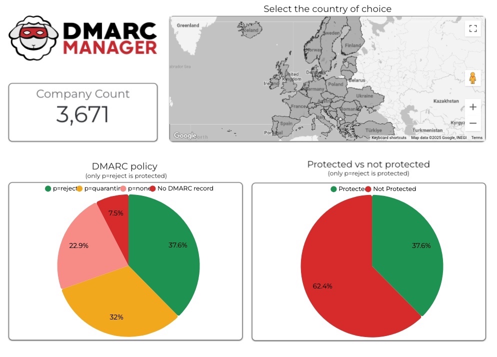 Dmarc Advisor biedt een fraai visueel overzicht, waarin per land kan worden bekeken in hoeverre bedrijven al dan niet 'beschermd' zijn. Zie onderstaamd overzicht op basis van 3671 bedrijven.