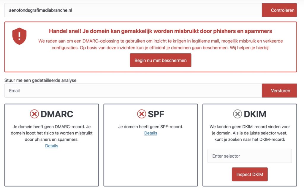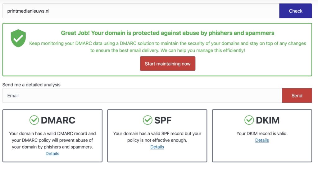 In de praktijk blijken veel partijen binnen de printmediabranche hun SPF en DKIM records wel (redelijk) in orde te hebben, maar DMARC instellingen zijn vaak onjuist (oranje). Een enkeling heeft de drie DNS records op juiste wijze ingesteld (groen). Maar er zijn ook nog genoeg domeinen die te weinig hebben gedaan om hun mailverkeer te beschermen (rood). Zie onderstaande galerij in willekeurige volgorde.