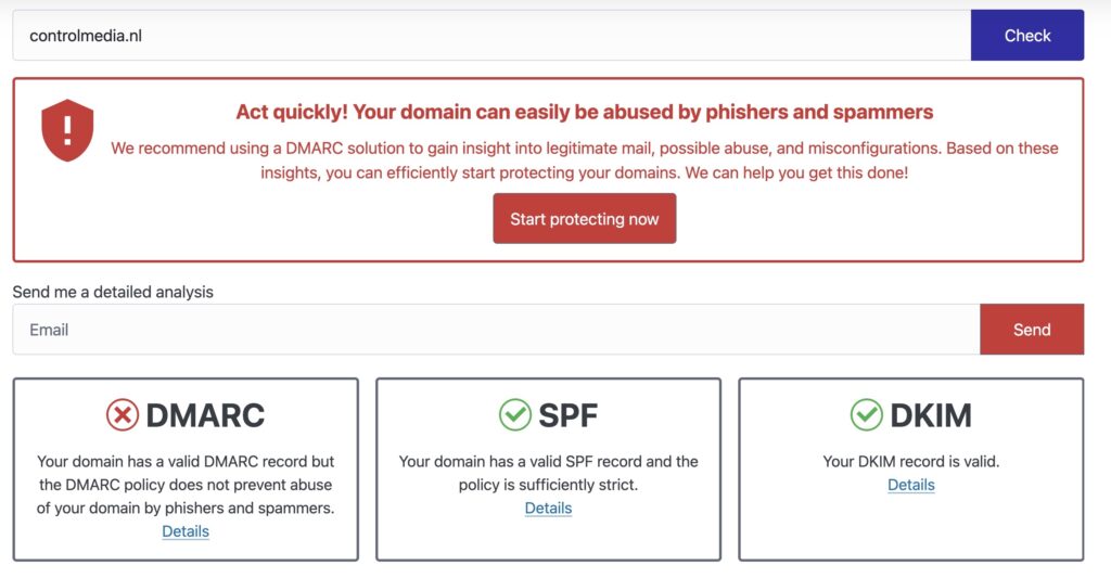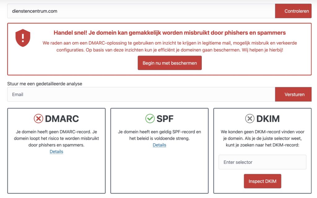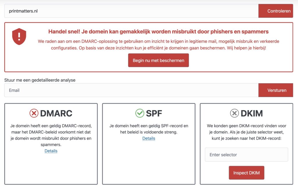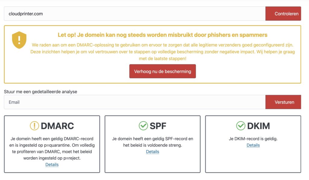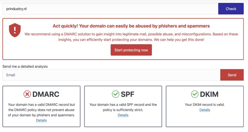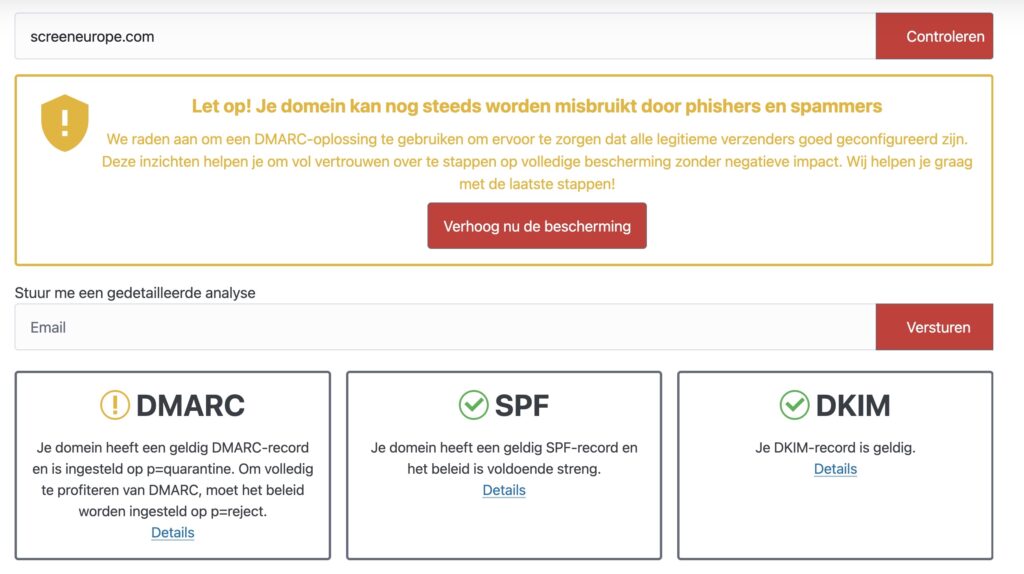 Wat bedrijven in ieder geval zelf kunnen doen, is het controleren of de drie genoemde records juist staan ingsteld, dat kan via PowerDmarc. Je kunt daar zonder gebruik maken van de SPF record checker, DKIM record checker en DMARC record checker om direct te zien of je DNS deze records bevat en correct zijn ingesteld.
