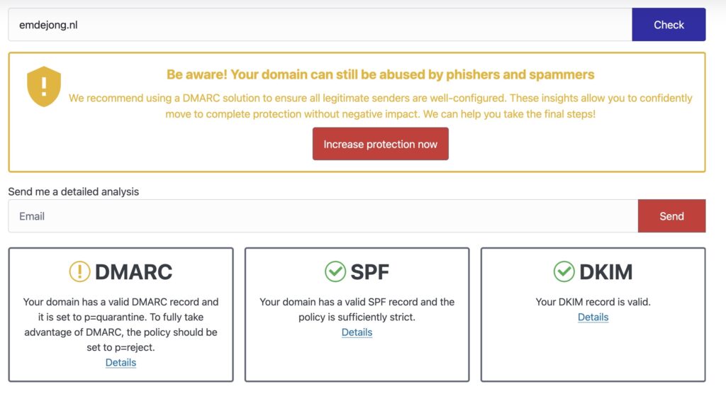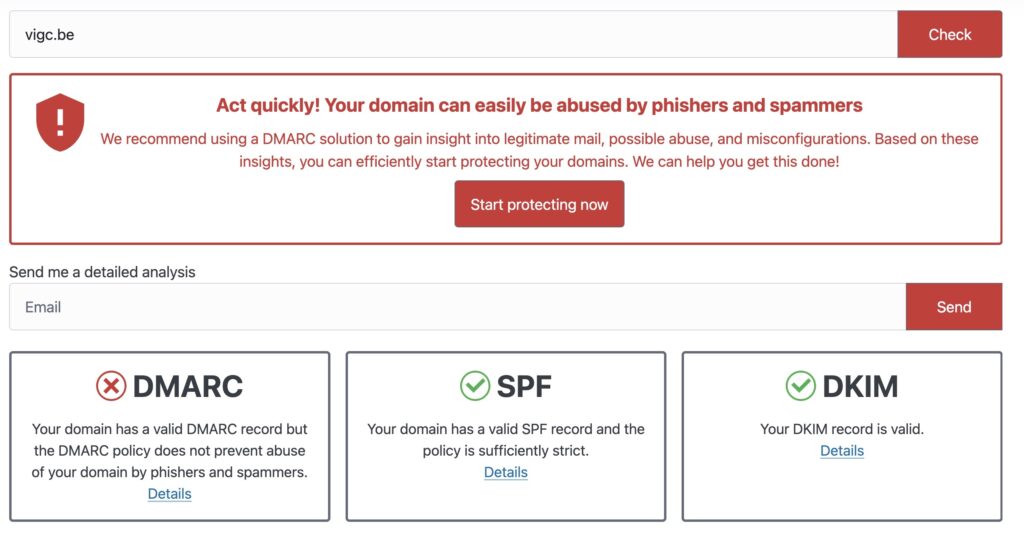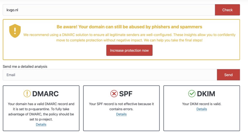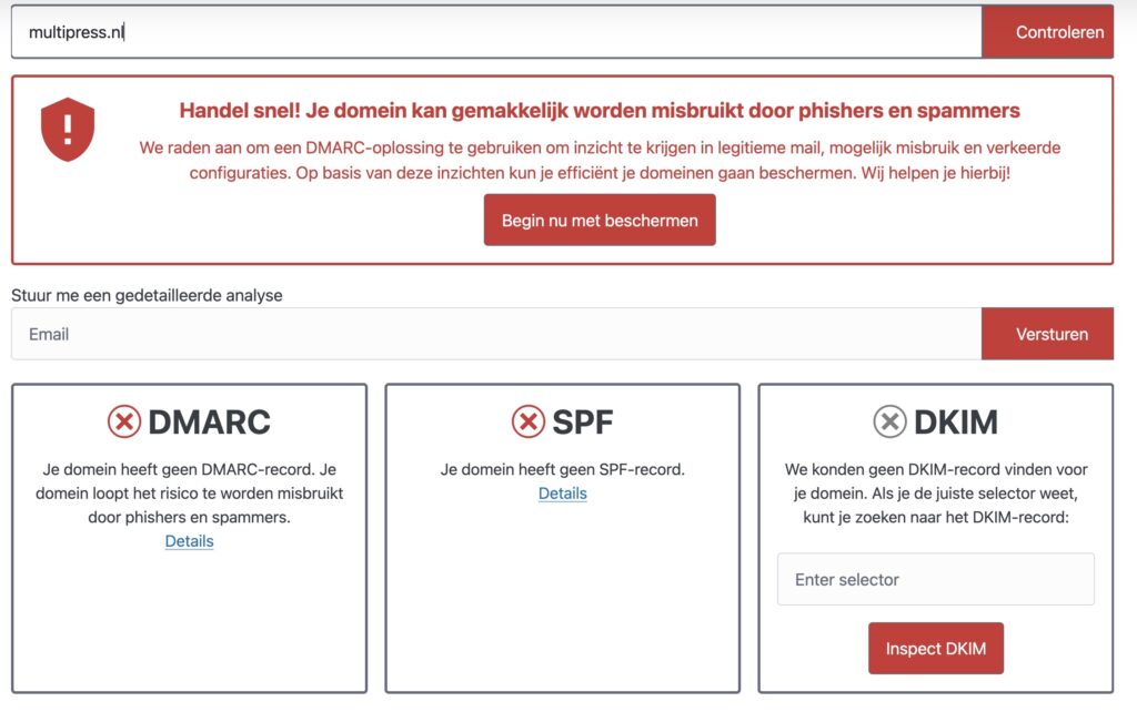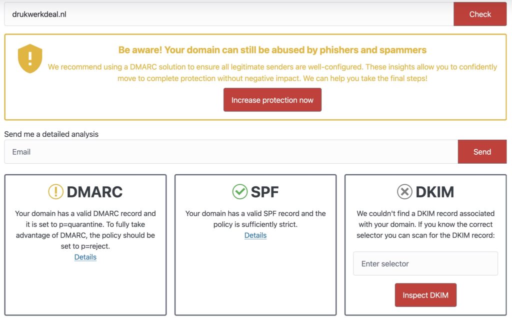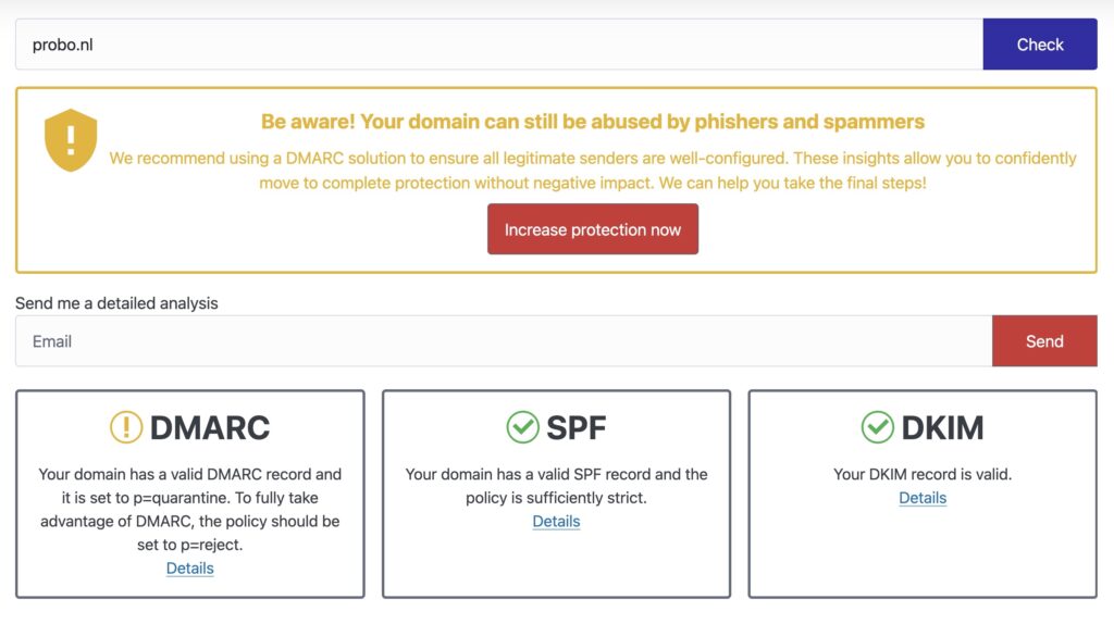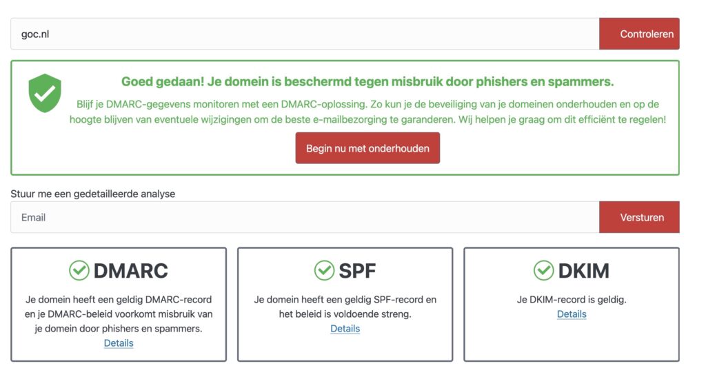 Wat bedrijven in ieder geval zelf kunnen doen, is het controleren of de drie genoemde records juist staan ingsteld, dat kan via PowerDmarc. Je kunt daar zonder gebruik maken van de SPF record checker, DKIM record checker en DMARC record checker om direct te zien of je DNS deze records bevat en correct zijn ingesteld.