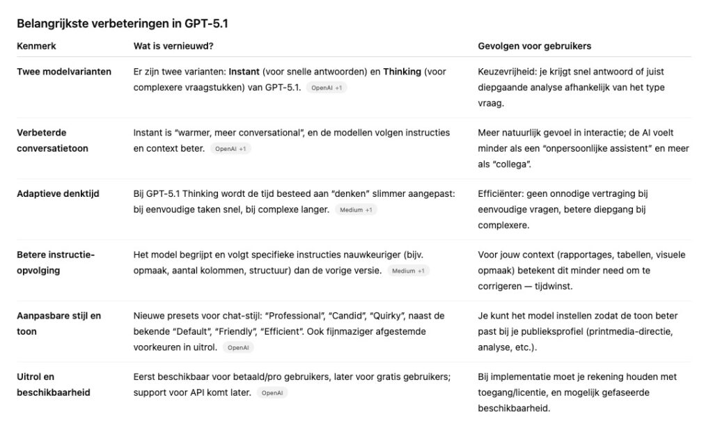 Printmedianieuws gebruikt de betalende versie van ChatGPT al langer en kan nu dus ook meteen gebruik maken van versie 5.1. De redactie heeft echter nog geen grondig onderzoek kunnen doen om vast te stellen of ChatGPT 5.1 daarmee ook beter is geworden voor de ondersteuning in de redactionele taken voor printmedianieuws.
