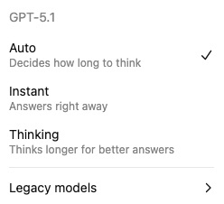 In 'Auto' beslist het taalmodel zelf wanneer het moet nadenken voor het antwoord geeft. Simpele vragen beantwoordt het direct, maar bij complexere vraagstukken neemt het de tijd via 'Thinking'.