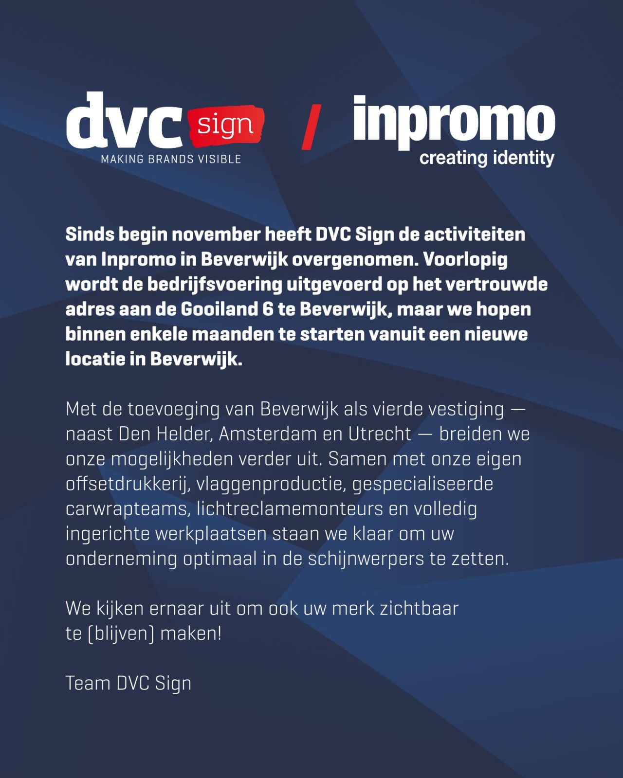 Met de overname haalt DVC Sign extra kennis in huis op het gebied van sign en textielbedrukking. “We breiden uit naar Beverwijk! Samen met oud-medewerkers van Inpromo geven we ons bedrijf een boost in Sign en voegen we een bak kennis en ervaring toe op het gebied van het leveren en bedrukken van kleding,” aldus het bedrijf op LinkedIn.