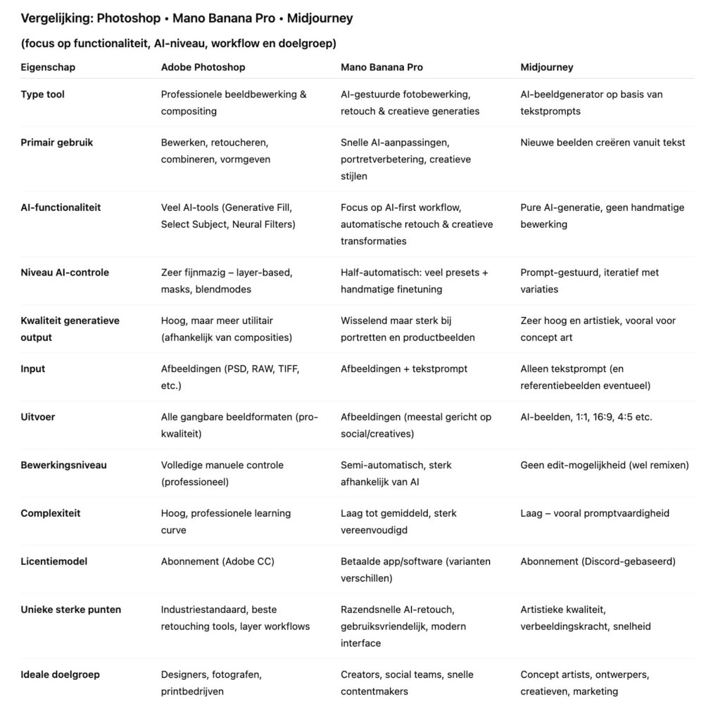 Het vergelijken van beschikbare gereedschappen is in de praktijk vrij lastig, juist omdat de ontwikkelingen zo snel gaan. Eén ding is zeker. Adobe Photoshop zal niet zo heel snel verdwijnen binnen de printmedia branche. De basis wordt nog altijd gevormd door professionele grafische bewerkingen in zowel RGB als CMYK, met daaraan gekoppelde kleurgamma's. De AI gereedschappen zijn als het ware tegen die basis 'aangeplakt'.