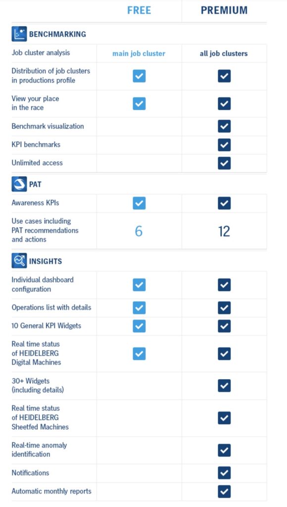 De software vereist de aanwezigheid van Prinect Workflow versie 2021.10. (PDF) Gebruikers van die software kunnen de premium versie software kosteloos testen. De onderliggende kosten voor het verder gebruik van de portal kon de redactie niet terugvinden, maar zal waarschijnlijk deel uitmaken van de verschillende onderhoudscontracten die Heidelberg aanbiedt. Ook is een gratis versie beschikbaar. Onderstaande tabel laat de verschillende functies zien.