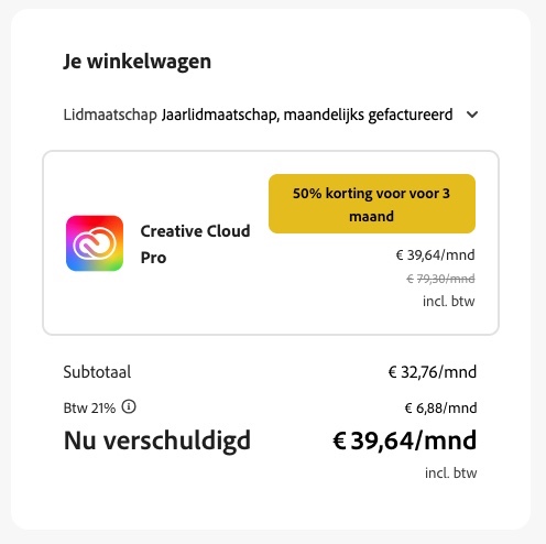 Verreweg de meeste applicaties van Adobe zijn 'los te koop' voor ca. 25 euro per maand. Hier en daar een aanbieding voor de helft van die prijs voor de eerste drie maanden, waaronder Adobe Photoshop. Wil je 'gewoon alles' hebben (de Pro versie), dan betaal je 80 euro per maand (waarbij de eerste 3 maanden ook 50% korting geldt). Uiteraard zin dat prijzen per werkplek.