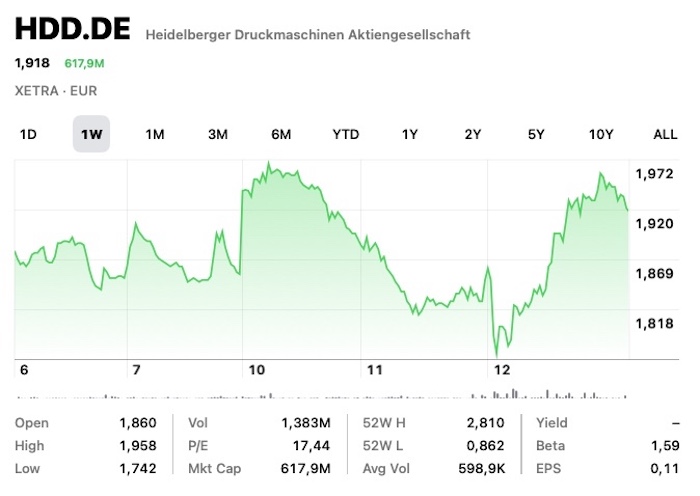 In de afgelopen twee jaar is het herstel van Heidelberg ook op de beurs duidelijk zichtbaar. Op 12 november 2013 stond de koers van een aandeel Heidelberg nog op €1,27, november 2024 noteerde € 0,99, maart dit jaar staat de koers inmiddels op ruim €1,90. Kijk je wat verder terug, dan 'piekte' de koers op 3 januari 2021 op € 2,94. Maar nog verder terug had Heidelberg nog betere cijfers met de de echte topkoers op 1 mei 2000, toen de waarde € 44,28 was. Daarbij opgemerkt dat de beurswaarde van een bedrijf doorgaans is omgeven door talloze irrationele 'gevoelswaardes', die zeker geen recht doen aan de werkelijk actuele situatie.