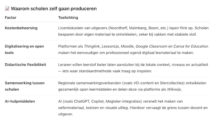 De beweging is nog geen grootschalige trend, maar het fundament is gelegd. Technologische vooruitgang, kostenoverwegingen en de behoefte aan meer didactische flexibiliteit maken dat scholen de rol van uitgever gedeeltelijk naar zich toetrekken.