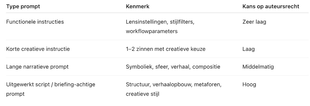 - Uitgebreide, creatieve prompts: ja, binnen 1–5 jaar via jurisprudentie